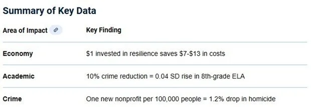 These findings suggest that investing in CBEL’s resiliency-producing activities, local education, and economic stability is a proactive strategy that creates a safer, more prosperous community.